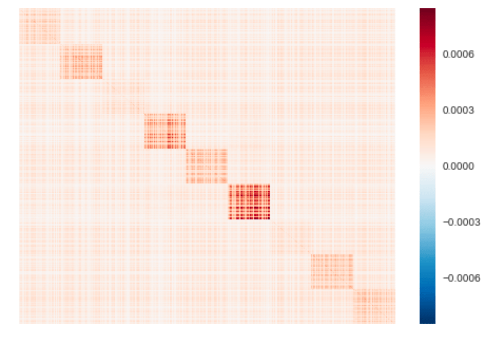 Decomposing the covariance matrix into its eigenvalues and eigenvectors, we can de-noise it by eliminating all eigenvalues below some threshold. Since the sample covariance matrix is positive definite, all its eigenvalues will be positive. Reconstructing a matrix from non-negative eigenvalues will likewise result in a positive semi-definite matrix. We thus don’t have to worry about the resulting matrix not being a proper covariance matrix, which can be a headache with more flexible estimation approaches. A heatmap of the reconstructed covariance matrix from the largest 10 eigenvalues is shown in Figure 7.