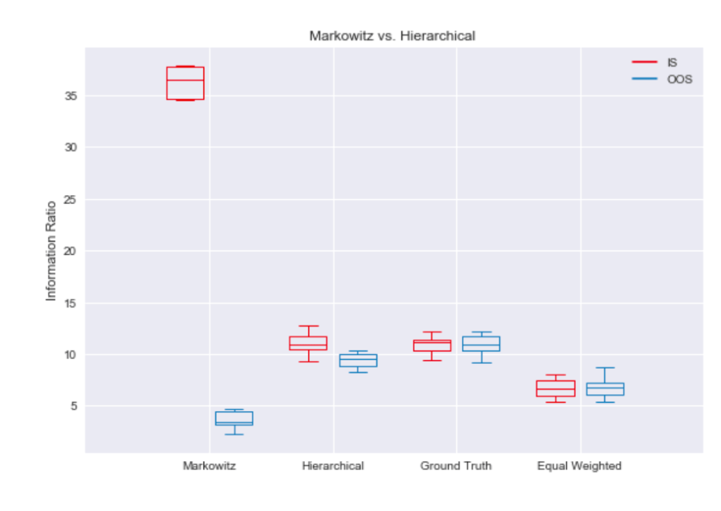 If we believe the above characterization of the problem is correct, it seems like a good idea to encode prior knowledge of industry clustering by optimize weights within clusters and then optimize allocation to these clusters. This hierarchical approach results in the in-sample and out-of-sample performance being much closer to the ground truth. Imposing structure, mean-variance optimization now beats equal weighting by a large margin.