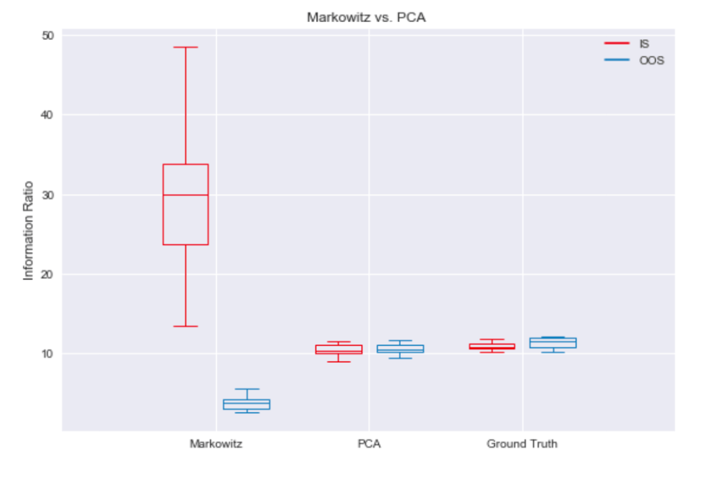Now, all stocks are still partly driven by the market, but industry returns are uncorrelated. Estimation errors may cause problems if one stock is falsely used as a hedging device for the industry exposure of another stock, and both stocks do not belong to the same industry. The overfit of Markowitz’s method to in-sample data can best be visualized by a boxplot. Figure 5 shows that the in-sample information ratio for the sample covariance optimization is way above the best possible portfolio using ground truth parameters. Unsurprisingly, this overfit hurts the out-of-sample performance, as it can’t even beat simple equal weighting.