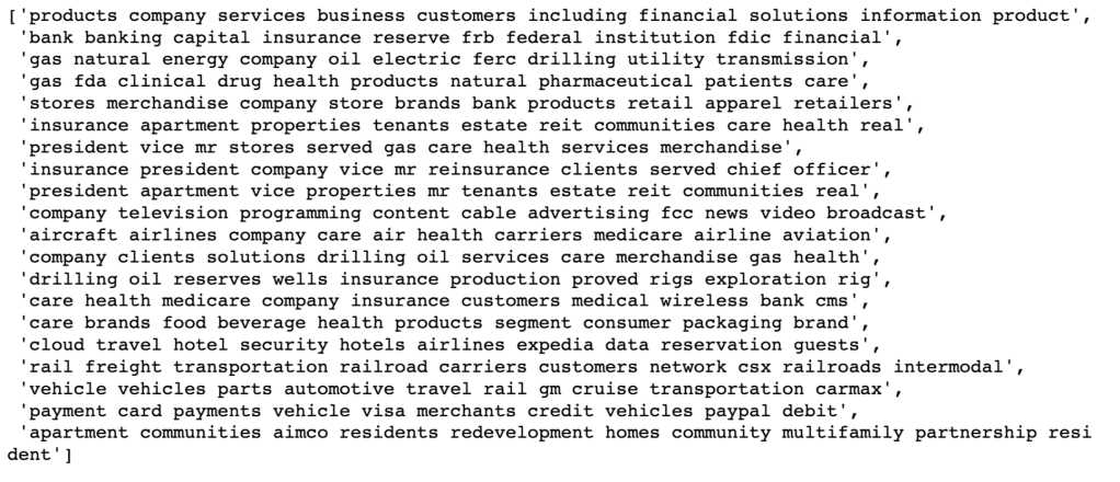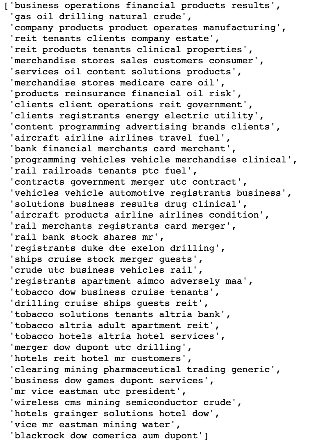 By singular value decomposition (SVD) of the tfidf-vectorized matrix, we can extract the most important topics. Figure 2 displays the 20 most important topics with its respective 10 most common terms. While not perfect — keep in mind we’re only using 387 documents — some clear patterns emerge. For example, the second topic relates to financial institutions, the third topic relates to energy companies, and the fourth topic relates to pharmaceuticals.